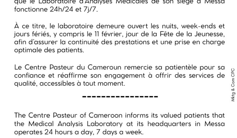Le laboratoire d’analyses médicales du Centre Pasteur du Cameroun, site de Messa, est ouvert au public 24h/24 et 7j/7